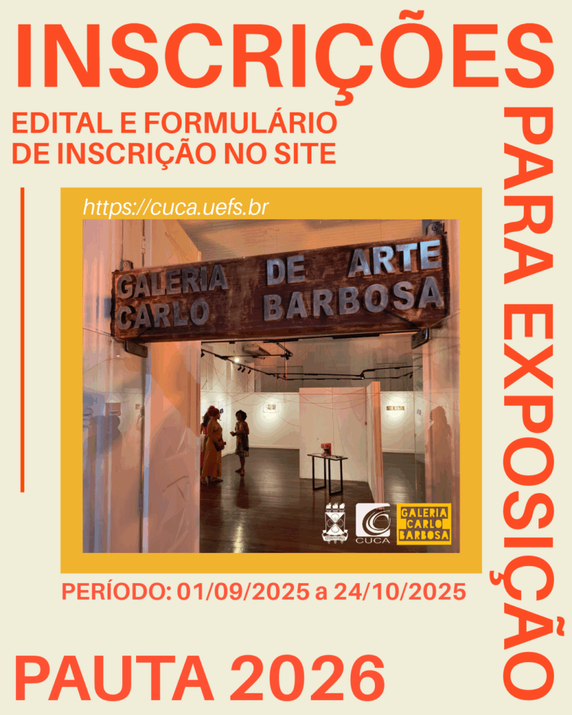 A Universidade Estadual de Feira de Santana (Uefs), através do Centro Universitário de Cultura e Arte (Cuca), abre inscrições para projetos de exposição para a pauta 2026 da Galeria de Arte Carlo Barbosa (GACB). As inscrições se iniciam no dia 01 de setembro de 2025 e permanecem abertas até o dia 24 de outubro de 2025, via formulário eletrônico.